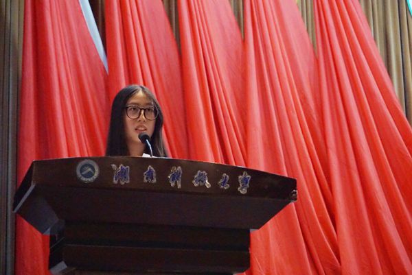 紧接着余蓉晖在典礼上为新生解读了学院学籍管理规定,她表示学生的本分就是刻苦学习,大学是青年学生学习的重要阶段,苦命的高中轻松的大学已经不复存在。同时她对新生提出了“三多一少”的要求,即多去图书馆、多去教室、多去运动场、少玩手机。并告诫全体新生:任何美好的理想和追求都不是唾手可得的,希望大家在以后的学习和生活中多一份持之以恒的勤奋,少一些虚度年华的安逸;从潇湘启航,努力拼搏,做一名遵守制度的优秀大学生。