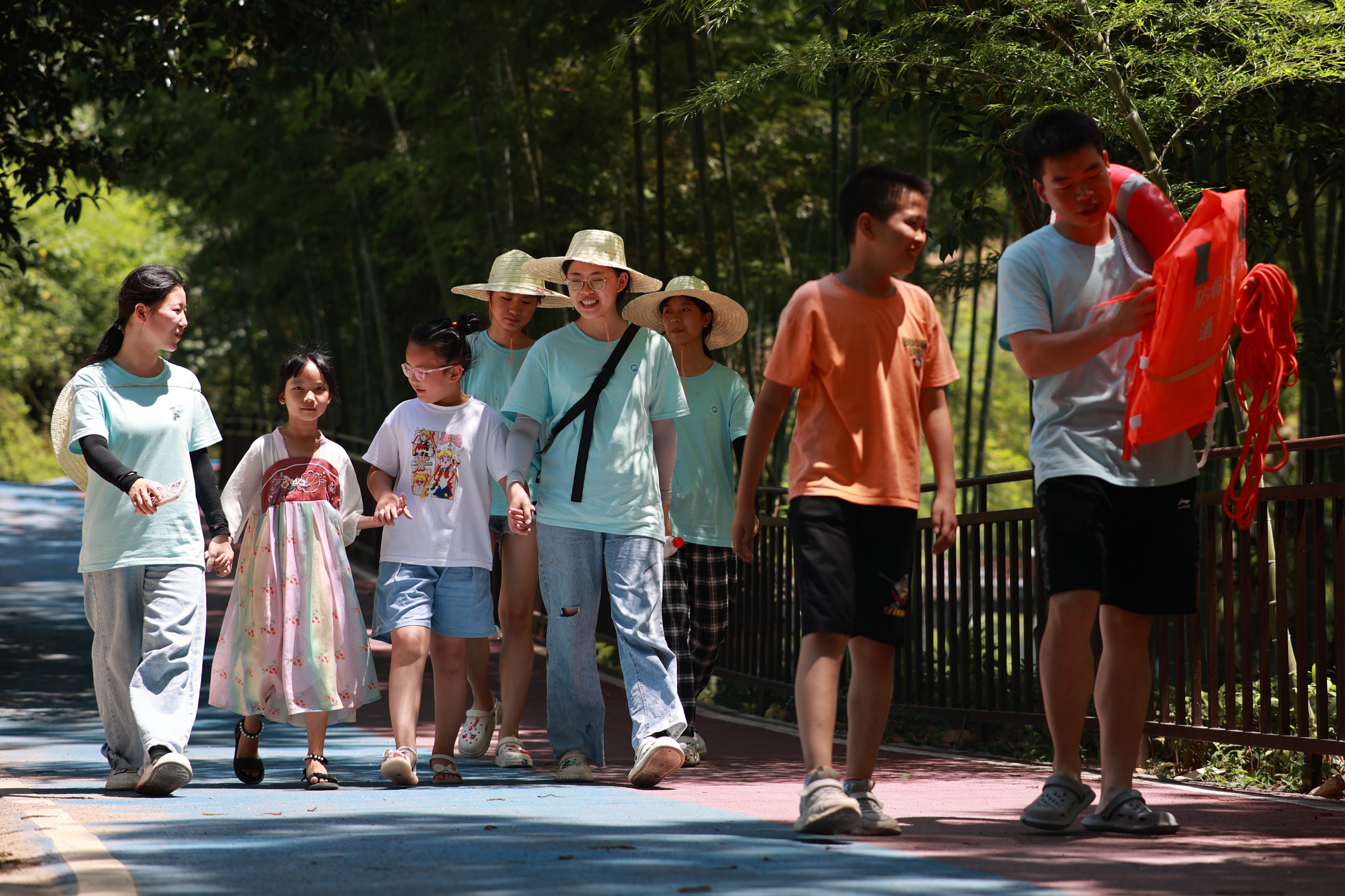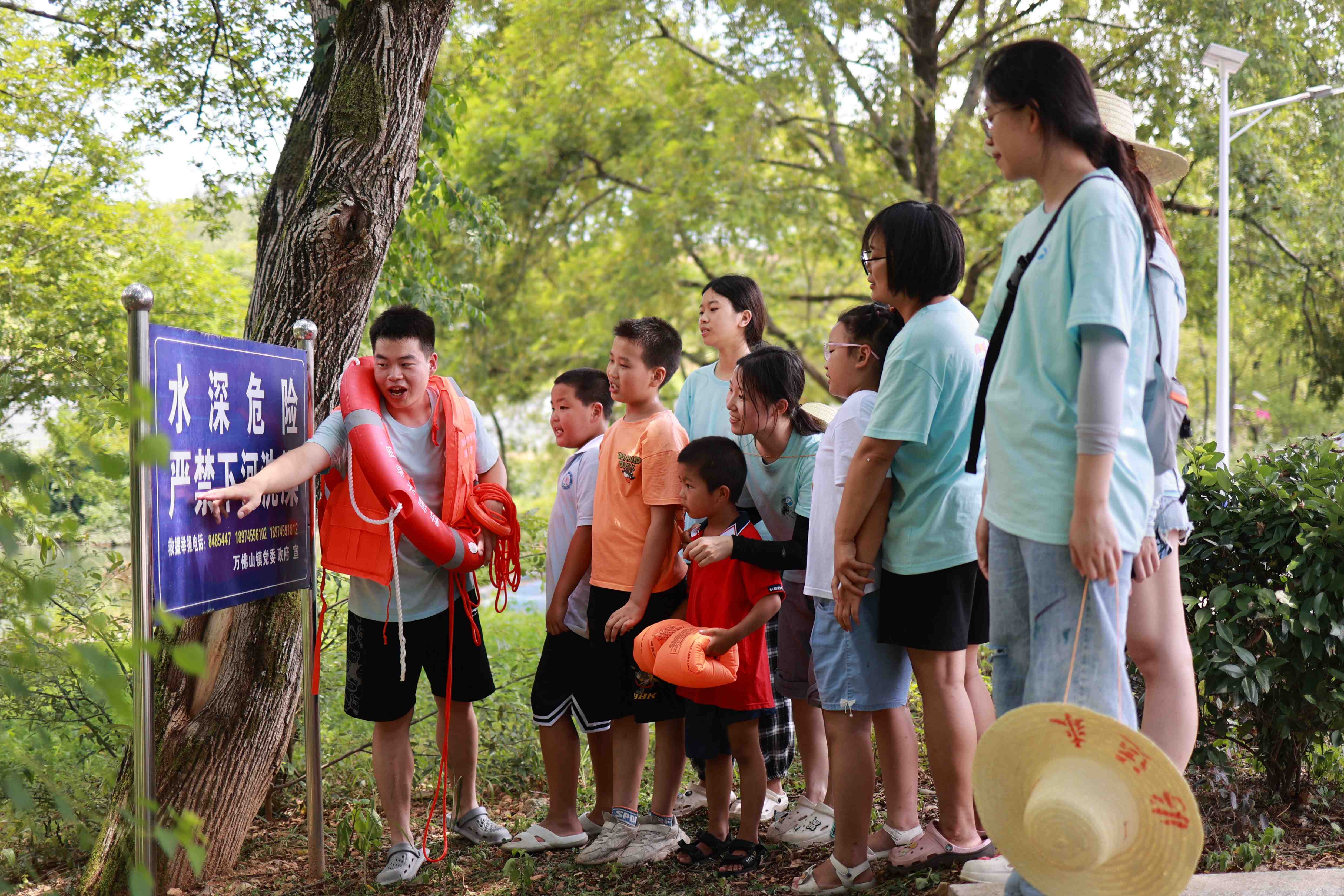 跨步、抛掷等一系列行云流水的动作,曾创来向孩子们展示救生圈的正确使用方法,手把手教孩子们如何正确佩戴救生衣。他提醒道:“使用救生圈时,应把救生圈抛在落水人员的下流方向。”随后,他向孩子们科普溺水时的系列自救措施,如保持冷静不乱动,眼睛尽量保持撑开的状态,屏住气去除重物;采取头向后仰头,口鼻露出水面,呼气浅吸气等。