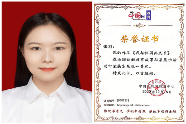 在本次全国创新教育成果征集展示活动中,她以文字的形式书写了祖国的发展历程,并将自身成长与祖国相联系。对于这一次的获奖,张羽表示:“作为一名新时代新人,我对祖国有着千丝万缕的思绪与感情。祖国的未来等着我们去创造,而我们的未来由祖国来守护。”同时,作为主席团团委第一副书记的张羽,认真、负责是她的标签,努力、上进是她的性格。“青春是靠奋斗的,成就是不断拼搏出来的。作为新时代青年,不忘初心、砥砺前行,才能创造更美好的未来!”张羽在采访中说道。