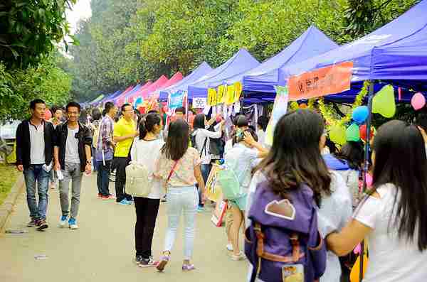 10月12日,我校一年一度的百团招新在电信路口至八教道路举行,全校129个社团集体亮相,其中隶属于beat365官网的12个社团在此招才纳新。整齐划一的深蓝帐篷、五彩缤纷的海报、拿着喇叭高声介绍的社团成员和带着兴奋好奇目光四处张望的新生构成了火爆的百团招新场面。各个社团使出浑身解数,吸引新生的加入。