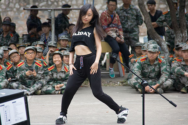 随着各排排长一声“坐下”,25个排的军训新生围成一个圈。身体挺得笔直,眼神里写满了期待。首先映入眼帘的是双人舞《青花瓷》,灵活挥舞的扇子,曼妙的舞姿伴随着轻柔的旋律,别有一番醉人之意,动人的爵士舞蹈《red light》,热烈而让人心动。