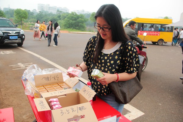 临近七点,天开始下起蒙蒙细雨。早签临时取消,大家都选择呆在被窝里,鲜有同学在摊位停留,诚信收入依然显示为零。雨越下越大,这时,一位手拿黑色提包的女孩,径自来到摊位前,拿起一个抹茶蛋糕和一瓶牛奶,自觉付了钱。
