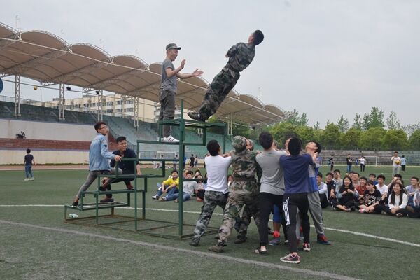 活动开展分为四个小组,由四名教官分别带队。四个小组的成员首先做了自我介绍,然后由教官带领做一元五角、坐地起身、信任背摔、毕业墙、穿越电网和团队有我更精彩六个项目。其中最精彩的部分要属信任背摔了,保护学员站成两排,前排学员伸直胳膊,掌心朝外,双手交叉,十指交叉握紧从胸前翻出,双手紧贴胸口。后排学员距前排学员一步,成弓步站立,两手向前平伸,手心向前,指尖向外,胳膊肘弯曲,准备做保护动作。台上的同学垂直倒下来由下面的学员接住。这个活动既紧张刺激,带动了现场气氛,又培养了学员之间团结协作的能力,增进了学员之间的互信,可谓一举多得。