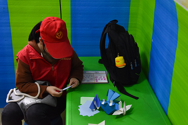 征得学校老师同意后,志愿者们分为两组进入活动教室和孩子们做游戏并教孩子们手工折纸。由于孩子们难以集中注意力,志愿者们重复示范着自己的动作,耐心地教孩子们折纸。“来,你们想要哪种颜色呢?”志愿者黄欣雨蹲在孩子中间,手举着彩色折纸,给孩子们呈现了一个五彩缤纷的世界。“小朋友们,注意看我的动作哦,先这样叠……”志愿者黄欣雨一步一步地教着孩子们折星星,还将她折好的星星送给孩子们。