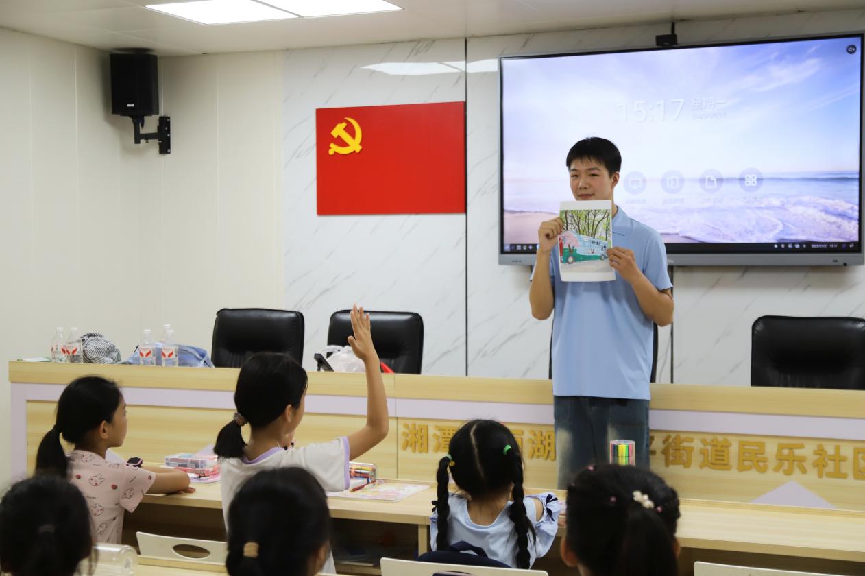 为增加社区孩子对本土文化的认知与热爱,助力提升美育素养,7月7日,beat365英国官网网站暑期“三下乡”实践团队在民乐社区开展趣味绘画课堂。本次课程由实践团成员喻庭隆进行授课,以“童心绘湘潭”为主题,带领学生探寻湘潭的建筑之美和自然之韵,鼓励小朋友们用画笔勾勒眼中独特的家乡风貌。
