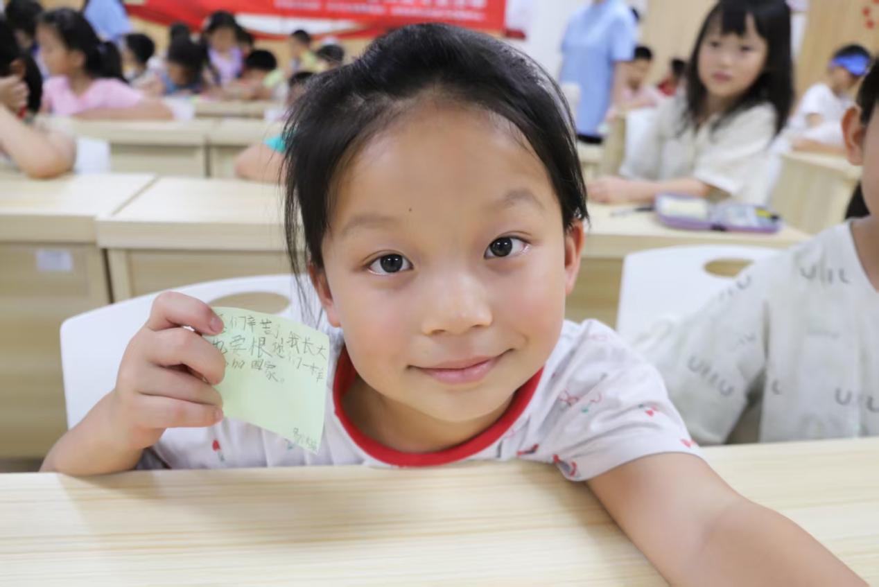 “你们辛苦了,我长大也要守护国家!”在“我想对您说”互动环节,孩子们用稚嫩笔触写下对先辈的告白。志愿者分发的便利贴上,既有对幸福生活的珍惜,更有“成为科学家”“当兵保卫祖国”等朴素理想。这些真挚表达,正是红色基因代际传承的生动注脚。
